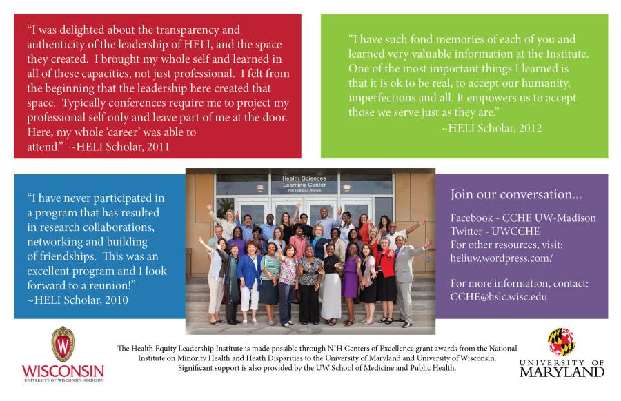 Please consider attending the University of Wisconsin’s 4th annual Health Equity Leadership Institute and join the 76 national Scholars who have graduated since 2010. 9-14, 2013